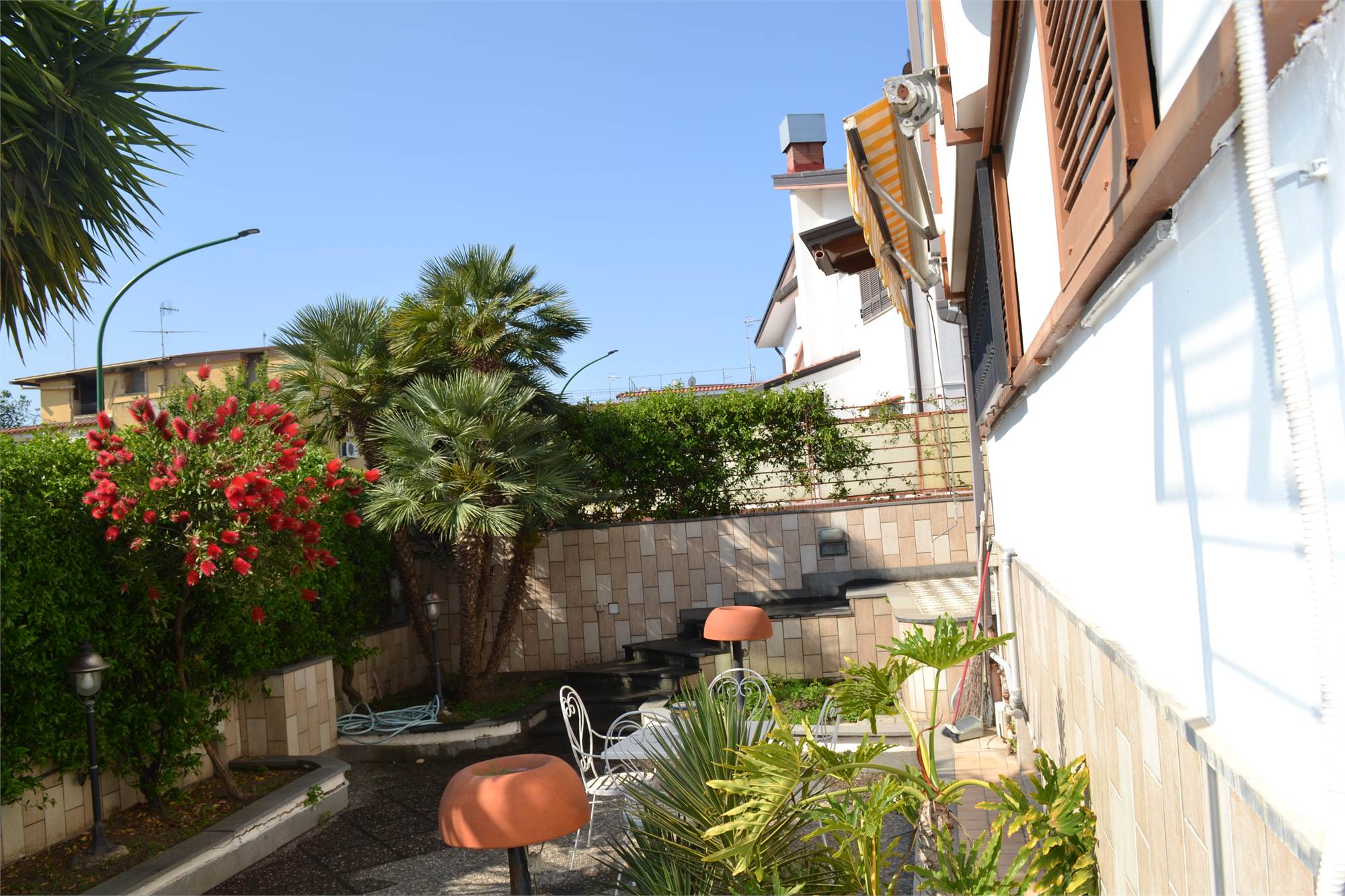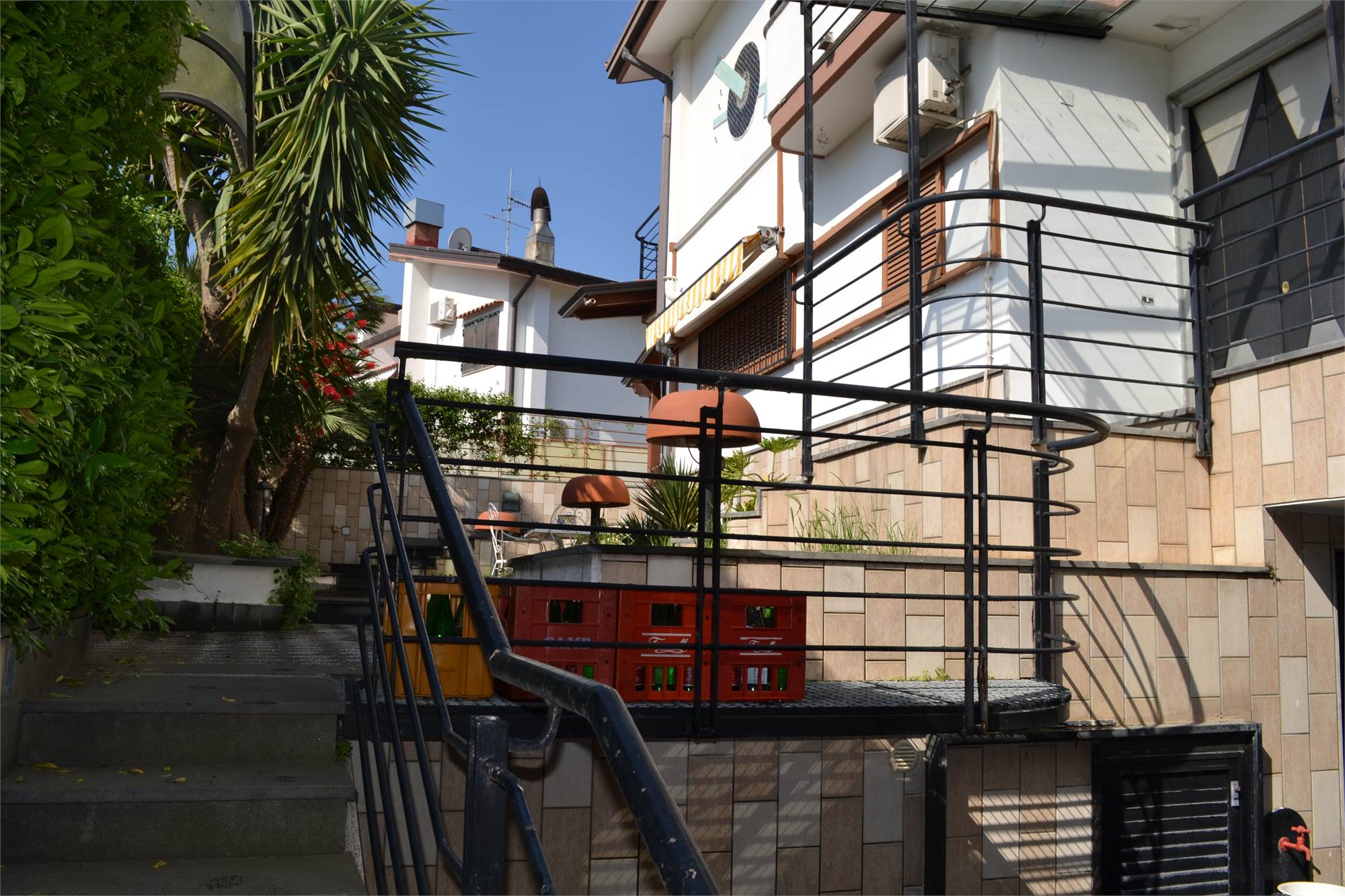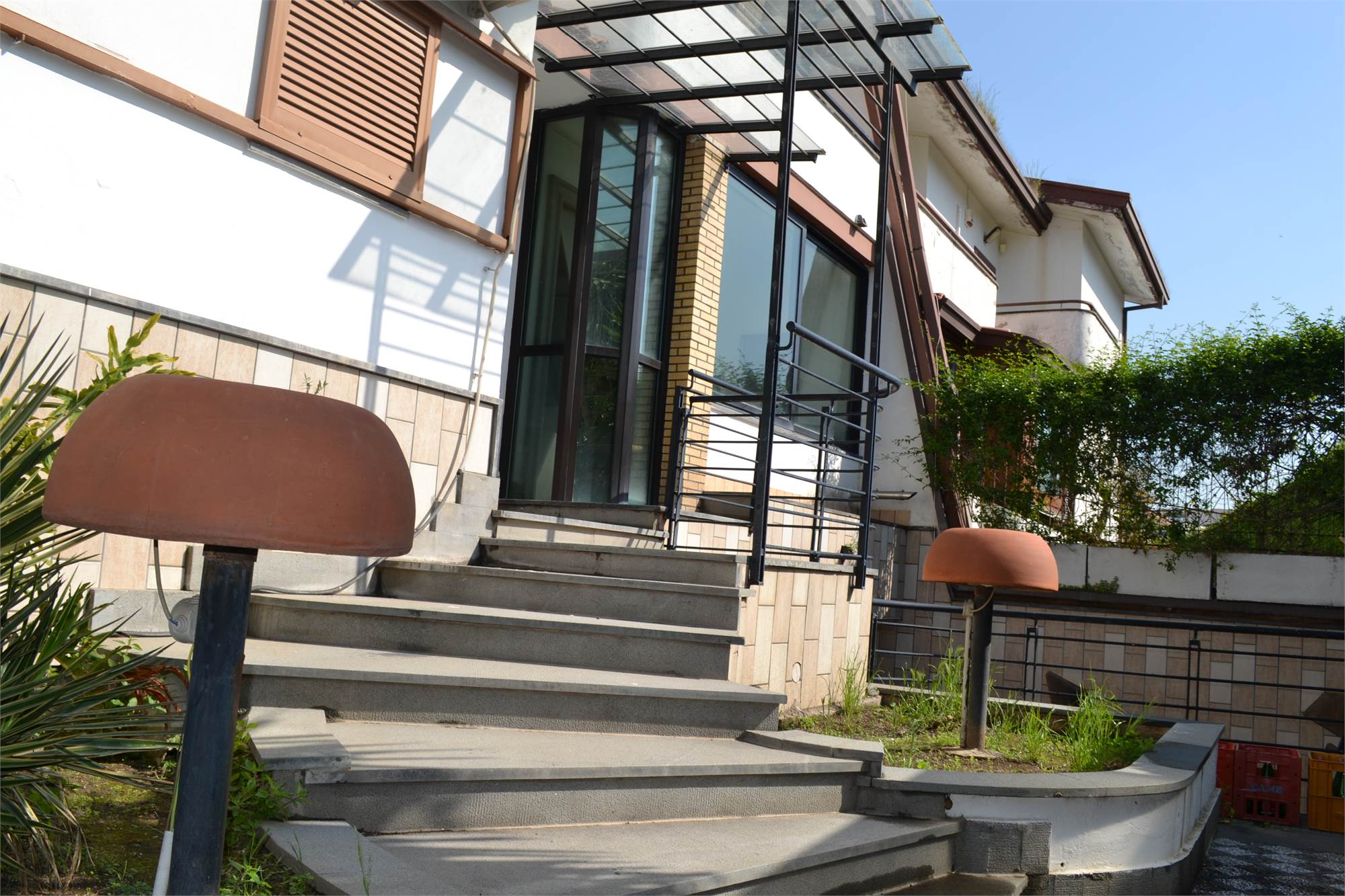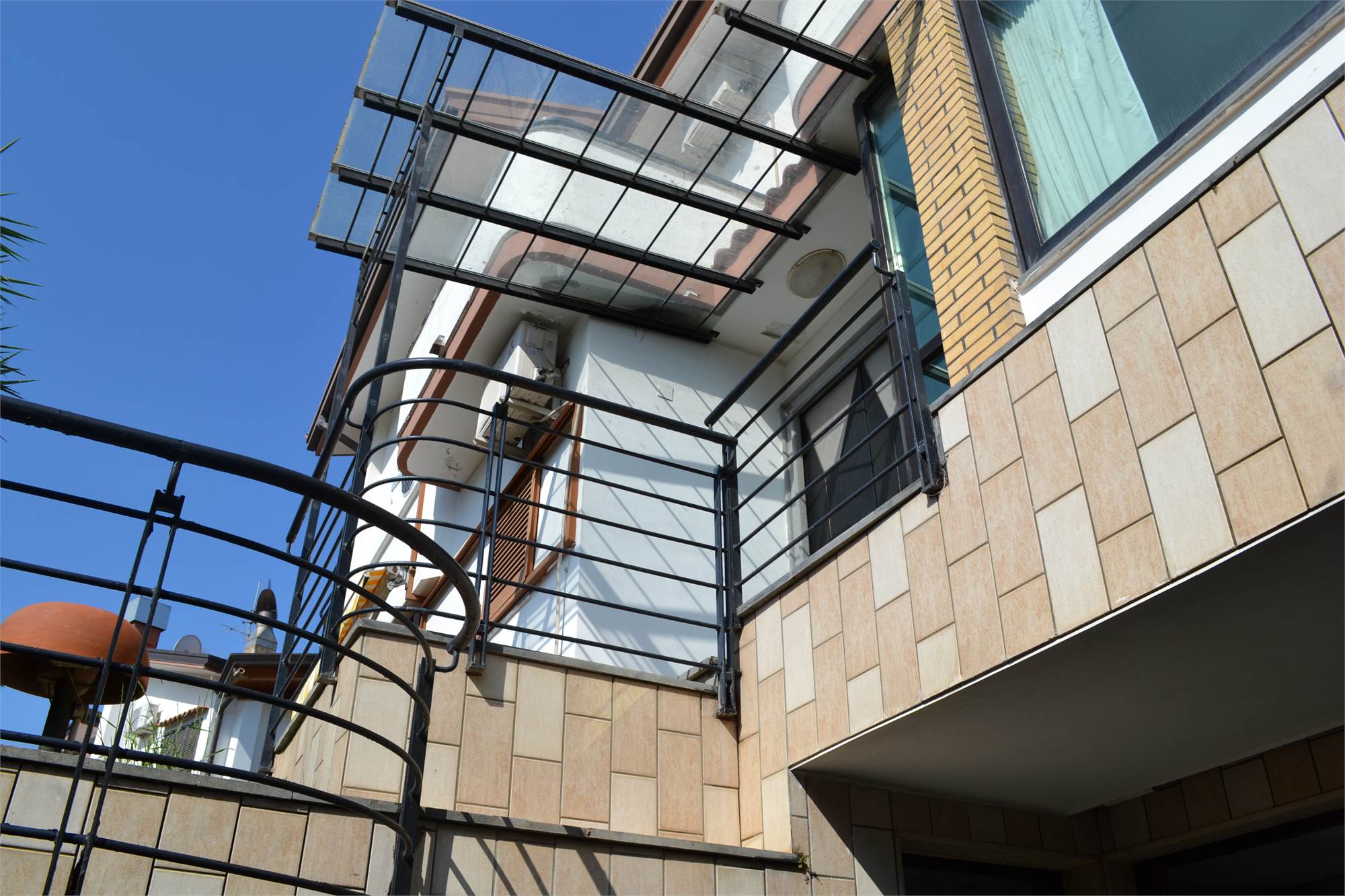 La villa ha un doppio accesso, sia da via Galileo Galilei che da via Leonardo da Vinci, al garage é possibile accedere direttamente dalla villa ed, inoltre, vi sono altri due posti auto coperti più diversi terrazzi a livello suddivisi tra i vari piani.