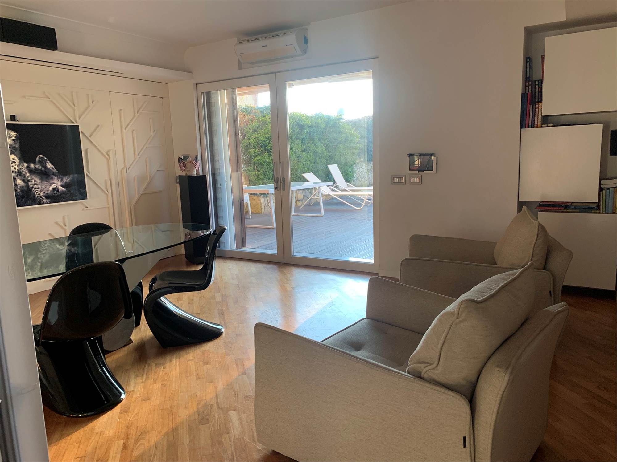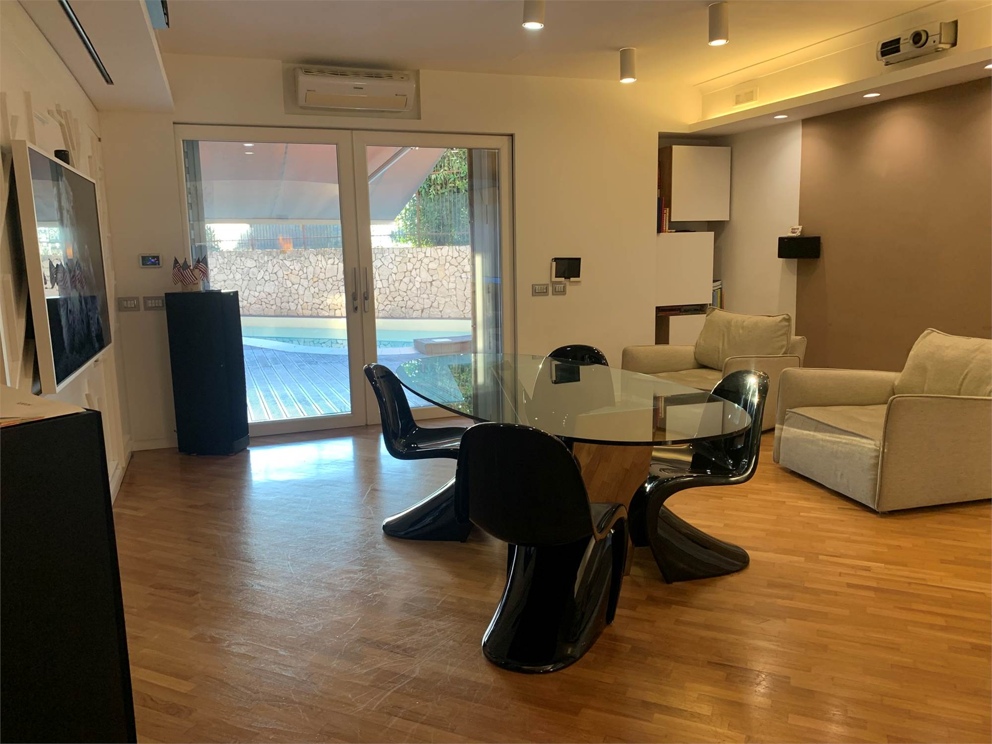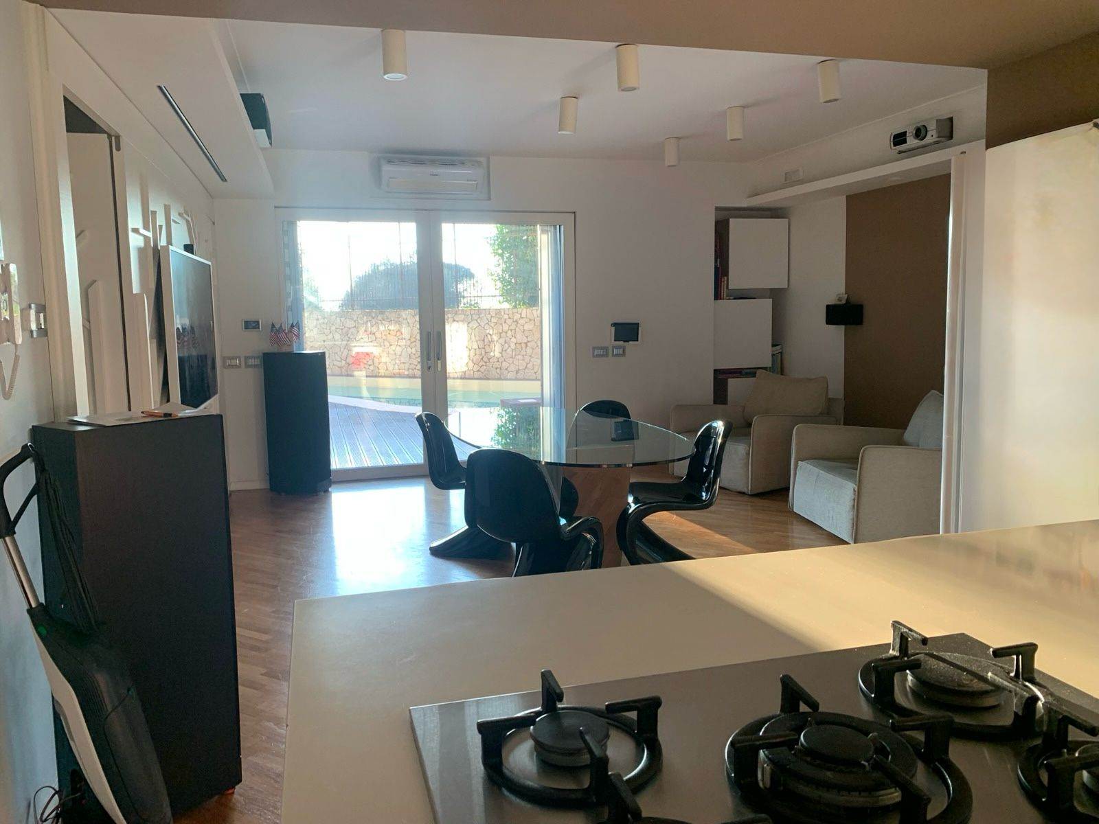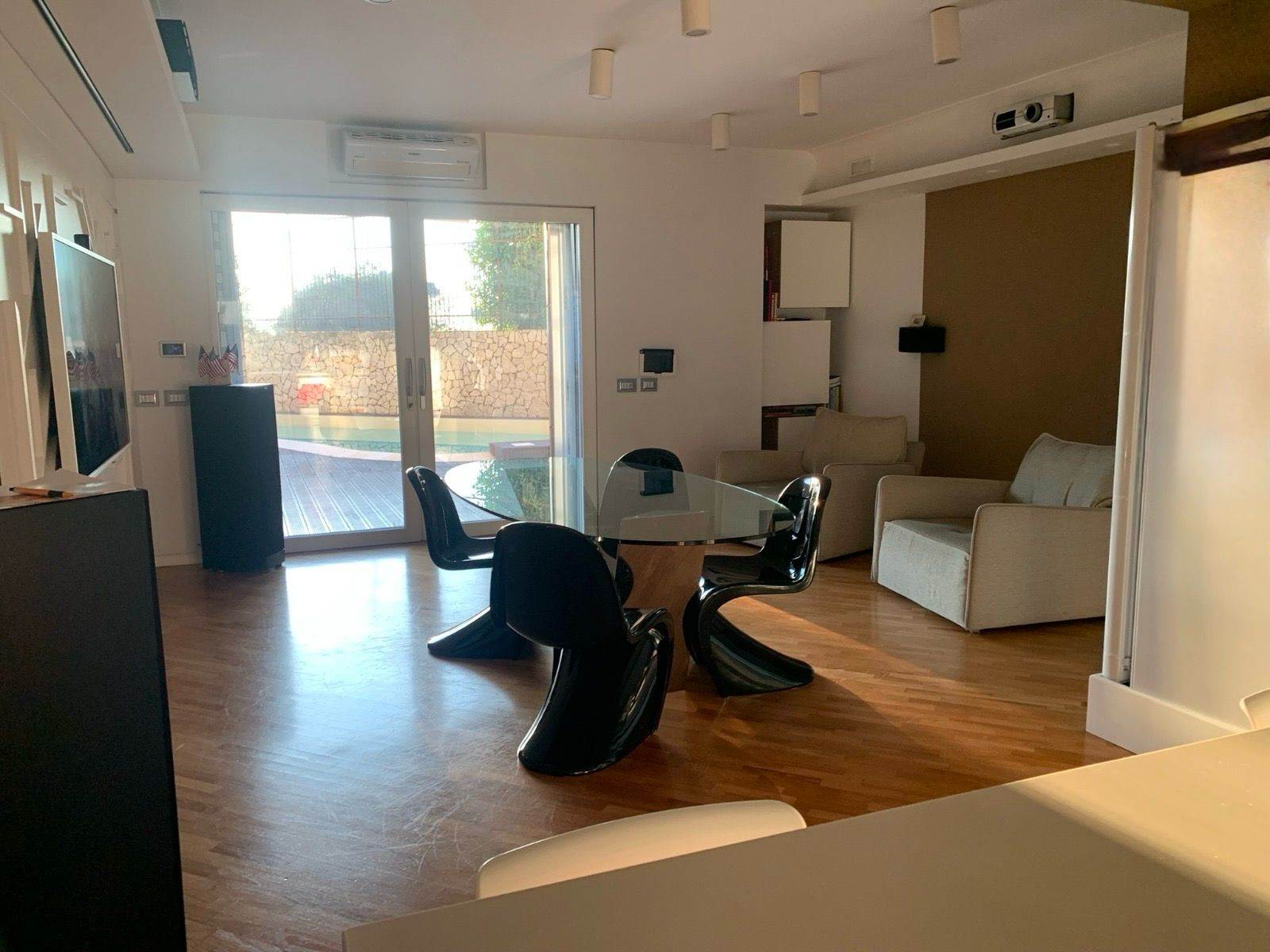 La proprietà si sviluppa su un unico livello di circa 115 mq, dove gli ambienti interni dialogano perfettamente con gli spazi esterni. L’ingresso conduce a un ampio salone con cucina open space, moderno e accogliente, con accesso diretto al terrazzo a livello completamente attrezzato: piscina, area solarium, docce esterne, filodiffusione e ogni comfort per vivere al meglio momenti di relax e convivialità.
